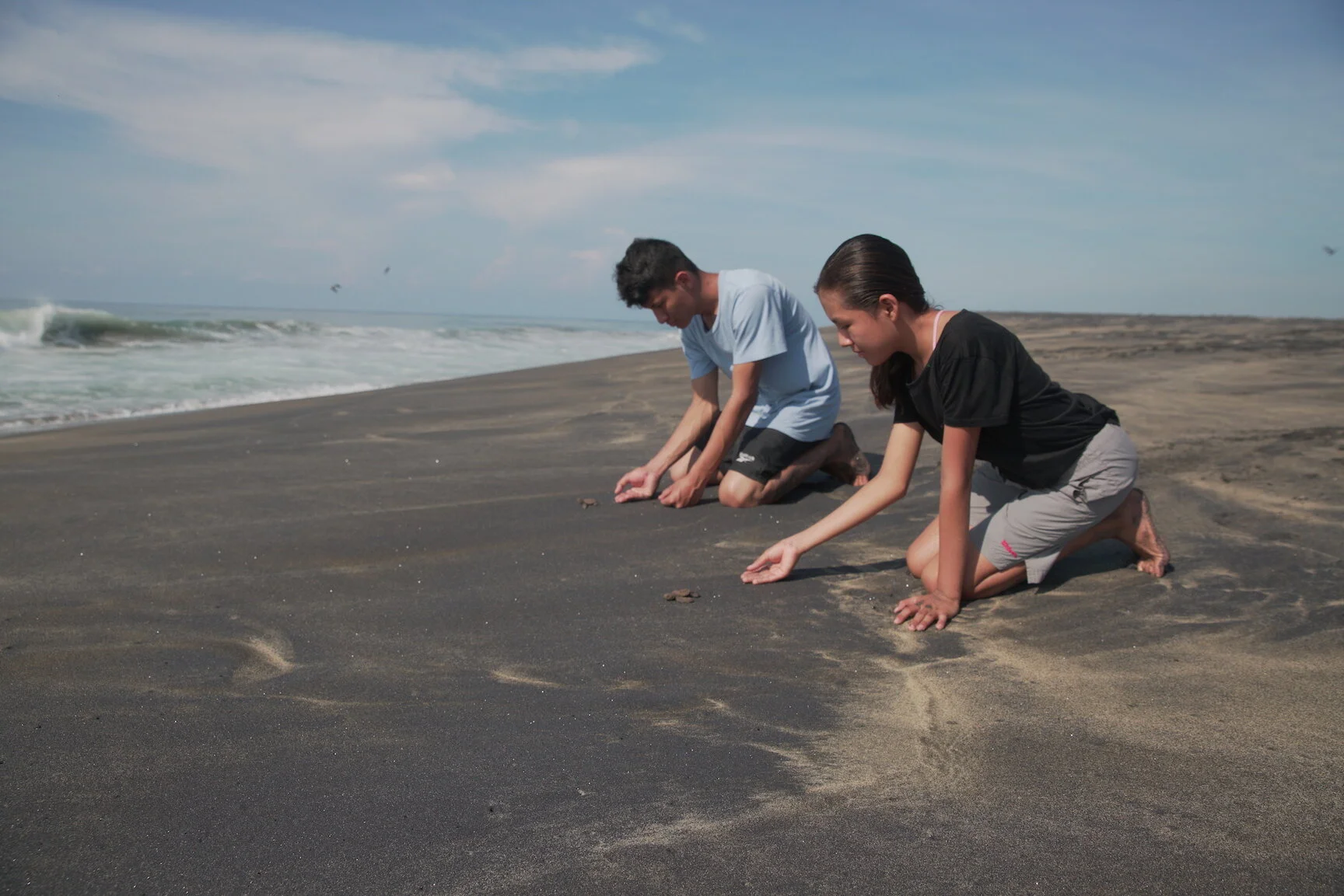 We sit beside him as he watches a mama turtle lay her eggs and then carefully collects the eggs and places them in a "nursery”, where they are safe from poachers and predators. Weeks later, he and his sister release the hatchlings into the sea.